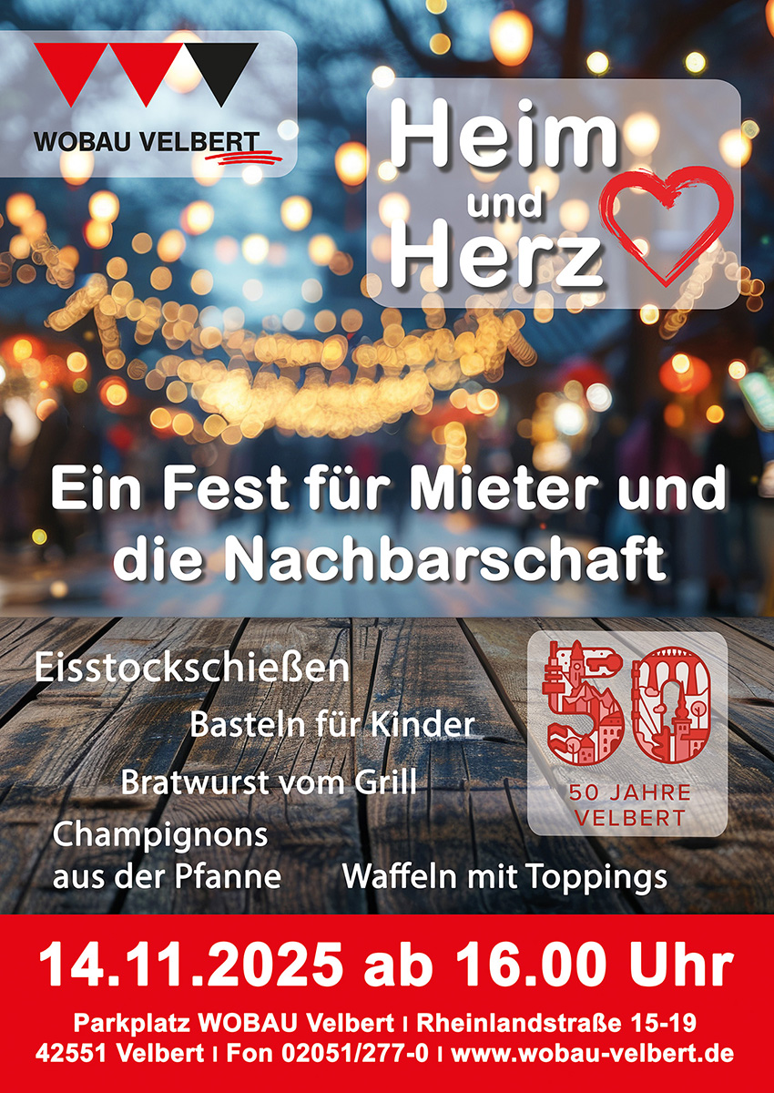 Wir laden alle Mieter, Nachbarn und Geschäftspartner ein zum Fest "Heim und Herz". Das Fest findet am 14.11.2025 ab 16 Uhr auf dem Parkplatz unserer Geschäftsräume in der Rheinlandstraße 15-19 statt.